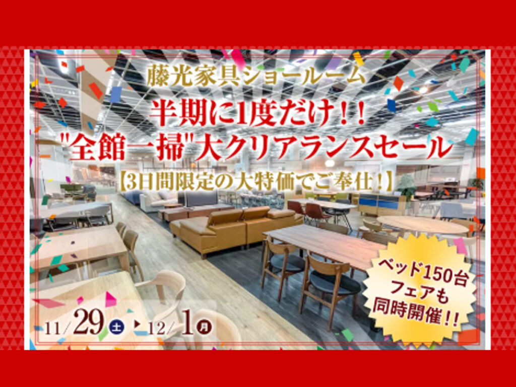 HOME > イベント イベントevent ご案内イベント重要なお知らせ イベント 半年に一度だけ!!‟全館一層”大クリアランスセール(11/29~12/1) ご来場ご予約はこちらをクリック 半期に1度だけ!!"全館一掃"大クリアランスセール "3日間限定"の特別価格でご提供!! 大阪で、ブランド家… MORE イベント GERVASONI/ジェルバゾーニ POPUPストア(9/2~9/30) 独創的で美しく高級感のあるコレクション 南大阪最大級の売り場面積を誇る、大阪・堺の大型家具ショールーム「藤光家具」の売場内にて2025年9月2日から9月30日までの約1か月間、イタリア… MORE