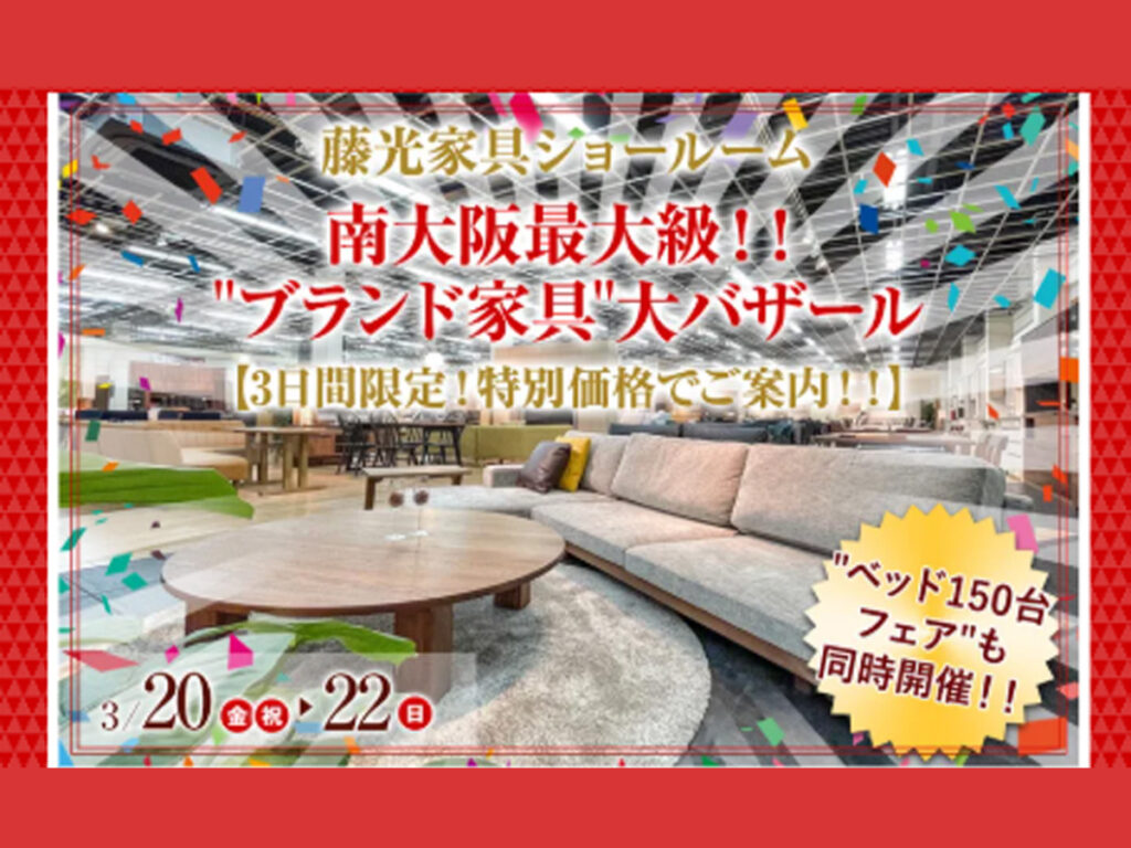 HOME > イベント イベントevent ご案内イベント重要なお知らせ イベント ‟ブランド家具”大バザール(3/20~22) ご来場ご予約はこちらをクリック 〜南大阪最大級の売り場規模!! 〜"ブランド家具"大バザール 【3日間限定!"ブランド家具"がWeb予約限定の特別… MORE イベント リーンロゼ・カリガリス大商談会(3/13~15) ご来場ご予約はこちらをクリック 南大阪最大級のショールームでご体感ください!! リーンロゼ・カリガリス 2大ブランドが特別価格に!! 大阪で… MORE イベント キッチンボード大直売会(3/13~15) ご来場ご予約はこちらをクリック 南大阪最大級のショールームでご体感ください!! 綾野製作所(AYANO)・パモウナ(Pamouna) のキッチンボ… MORE イベント GERVASONI/ジェルバゾーニ POPUPストア(9/2~9/30) 独創的で美しく高級感のあるコレクション 南大阪最大級の売り場面積を誇る、大阪・堺の大型家具ショールーム「藤光家具」の売場内にて2025年9月2日から9月30日までの約1か月間、イタリア… MORE