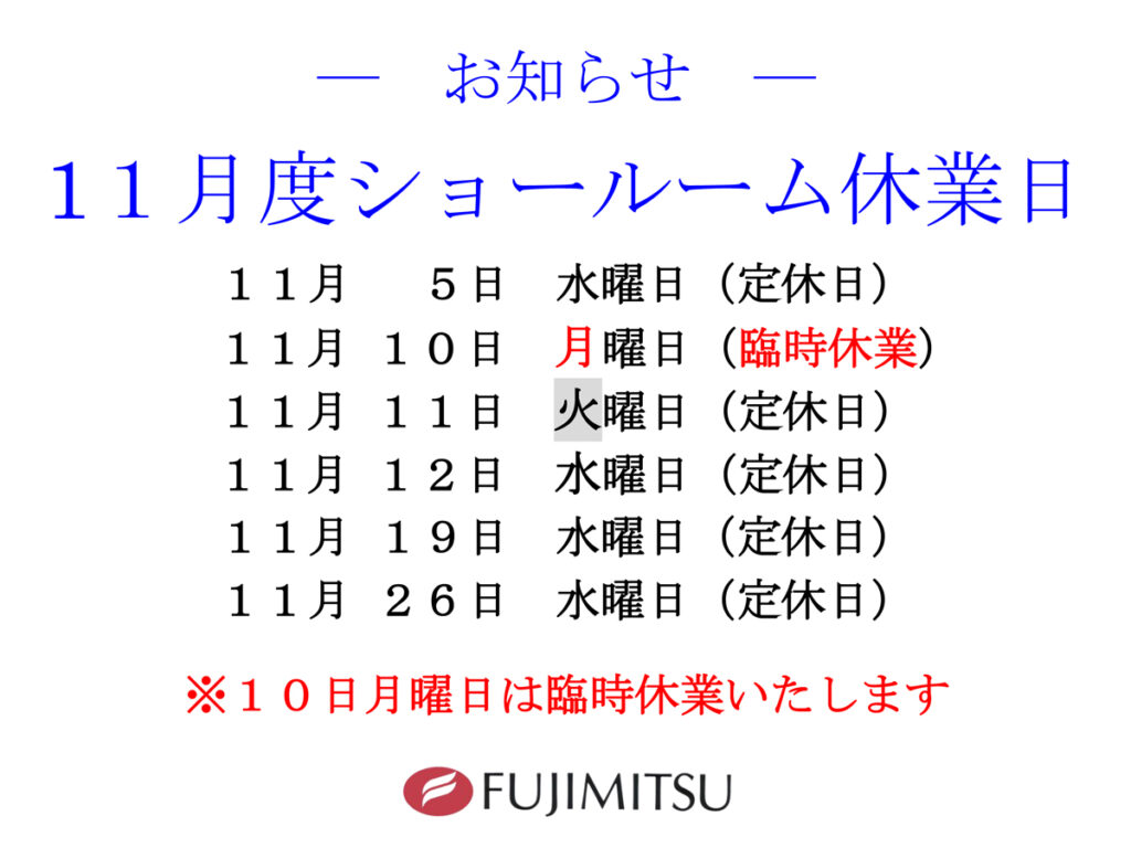HOME > お知らせ > 11月度ショールーム休業日のお知らせ