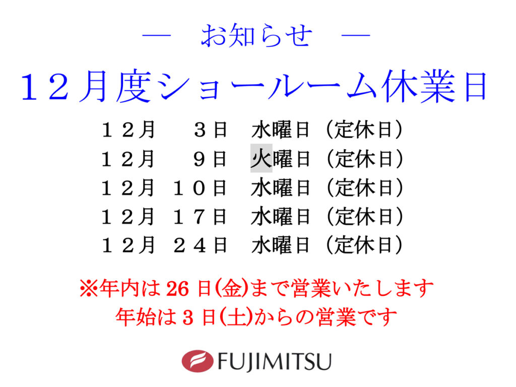 HOME > お知らせ > 12月度ショールーム休業日のお知らせ