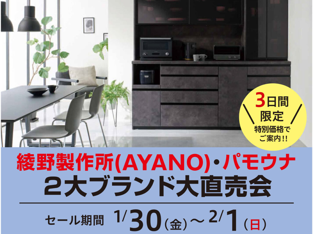 綾野製作所(AYANO)・パモウナ 2大ブランド大直売会(1/30~2/1)